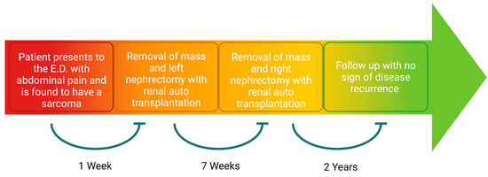 The management of bilateral retroperitoneal liposarcomas is extremely challenging. In the retroperitoneal location, the kidney is frequently encroached upon, or encased by, retroperitoneal sarcomas. In one study, retroperitoneal sarcomas demonstrated an absence of kidney invasion in 73% of cases, with renal capsular invasion present in 15%, parenchymal invasion in 9%, and renal vein invasion in 3% of cases [10]. The most common practice is unilateral nephrectomy. Nephrectomy leads to increased rates of acute kidney injury, acute renal failure, and a decreased glomerular filtration rate; however, end-stage renal disease and dialysis rarely occur [5,11,12]. Although many patients will do very well with a solitary kidney, organ preservation, if possible, should be the treatment objective [13,14]. Ex vivo multi-visceral explanations, tumor resections, and reimplantations have been reported anecdotally for mesenchymal tumors involving the porto-mesenteric vessels [15]. The Transatlantic Australian RPS Working Group (TARPSWG) has shown that, in the setting of a greater multi-visceral organ resection, the post-operative morbidity increases; however, this did not impact the overall survival, local recurrence, or distant metastasis of the disease. This group stressed the importance of the consideration of a multi-visceral resection, as systemic and radiotherapy efficacy remains limited [16]. Similarly, a unilateral renal auto-transplantation after the en bloc resection of a giant retroperitoneal sarcoma with a kidney has been reported (Table 1). To our knowledge, the ex vivo resection of a tumor, and the auto-transplantation of both kidneys, has not been reported for mesenchymal stromal tumors. The ex vivo resection and reimplantation of the kidney has three theoretical benefits. It provides an improved ability to clear the tumor around the kidney, potentially with less blood loss and tumor spillage. Kidney auto-transplantation moves the kidney from the retroperitoneal location, preventing recurrences from impacting the kidney and, potentially, making subsequent resections easier if, or when, needed. Thirdly, moving the kidney to the intraabdominal pelvis would allow the easier and potentially safer application of ablative therapies, such as radiation and radiofrequency ablation, to the region of the retroperitoneum, should recurrence occur.