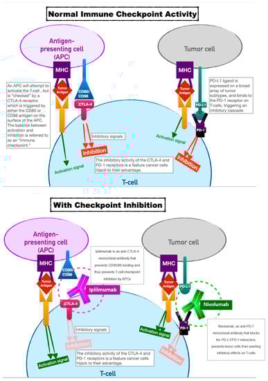 The first immune-checkpoint inhibitors approved for human use were Ipilimumab and Nivolumab (2011 and 2014, respectively). Ipilimumab acts as a monoclonal antibody against CTLA-4 and Nivolumab against PD-1. Ipilimumab was initially shown to dramatically improve survival in patients with metastatic melanoma [15]. The subsequent arrival of Nivolumab showed promise for the two used as combination therapy both for metastatic melanoma and several other cancers—renal cell carcinoma, unresectable non-small-cell lung cancer (NSCL), prostate cancer, and esophageal cancer [15,16].