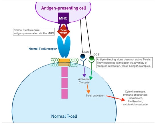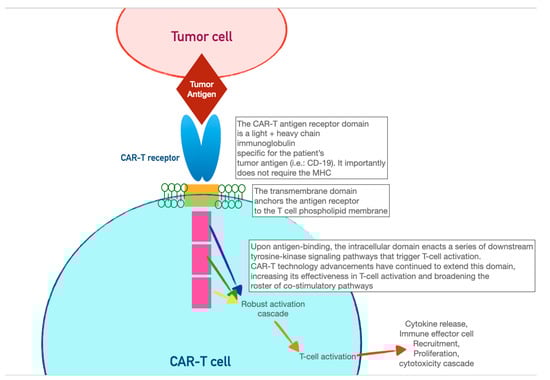 First, T cells are extracted from the patient (or an allogeneic donor) and modified via a retroviral vector to express a new antigen receptor and co-stimulatory domains (see Figure 2). The term “chimeric” refers to the fact that this engineered receptor both activates and co-stimulates the T cell [49,50]. The patient is then leuko-reduced to increase the relative proportion of CAR-T cells, and CAR-T cells are infused into the patient. The CAR-T cells will recognize antigens and activate and recruit immune effector cells to destroy tumor cells.
