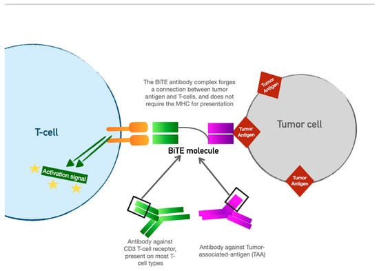 - Helwick, C. Novel BiTE antibody mediates contact between T cells and cancer cells. Oncol. NEWS Int. 2008, 17. [Google Scholar]