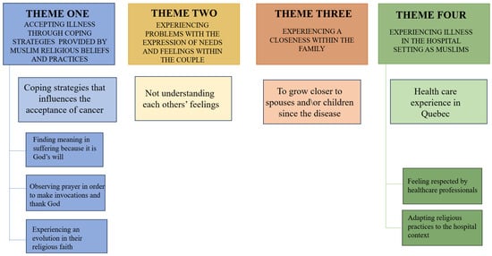 Participant characteristics are presented in Table S1. This study’s population was six couples of married individuals (n = 12) affected by cancer who identified with the rites, customs, and traditions of Arab culture and the Muslim religion, regardless of the branch of Islam to which they belonged and their level of religiosity. The average age of the participants was 52 years; all the couples had children at the time of the diagnosis; most participants immigrated to Canada more than ten years ago; and two couples were Moroccan, two were Algerian, two were Lebanese, and one was Canadian Moroccan. Within the participants who suffered from cancer, three had breast cancer, one had nasopharyngeal cancer, one had metastatic prostate cancer, and one had Hodgkin’s lymphoma. Most participants were Sunni, and two were Shiites. Regarding the level of religiosity, two participants described themselves as “Spiritually Awake”, three as “Somewhat Religious”, four as “Fairly Religious”, two as “Highly Religious”, and one as between “Fairly Religious” and “Highly Religious”.