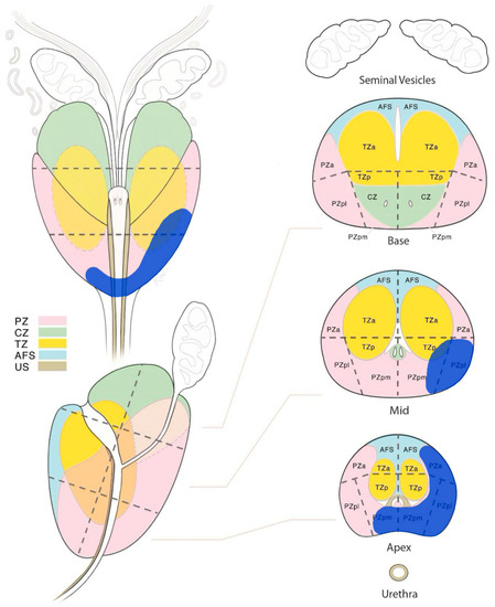 The multi-parametric magnetic resonance imaging diagram, showing the dominant intraprostatic lesion (blu area) in the lower and medium/middle third of the prostate. PZ: peripheral zone, CZ: central zone, TZ: transizional zone, AFS: anterior fibromuscolar stroma, US: urethral sphincter, a: anterior, p: posterior, m: medial, l: lateral.