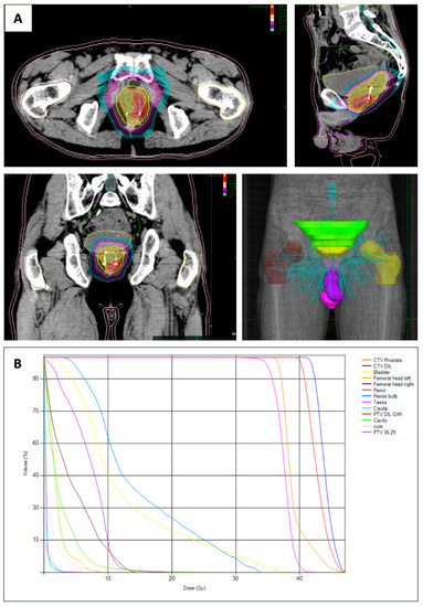 In therapeutical workup, radiation therapy (RT) has progressively emerged as a well-established treatment modality in localized PCa [3], with the use of dose-escalated intensity-modulated radiation therapy (IMRT). To ensure a precise irradiation of the target volume, different treatment techniques and different image-guidance systems have now become available, leading to the use of image-guided RT (IGRT) as a gold-standard. Further recent advances in imaging, treatment-planning and delivery systems have increased interest in hypofractionation, leading to the use of fewer large doses per fraction delivered in a very short treatment time [4,5,6]. Similar treatment approaches in the case of RT with more than 4 Gy per fraction have been defined as ultra-hypofractionated regimens [7], showing biochemical control comparable with the one obtained by conventional fractionation with similar toxicity profiles [8].