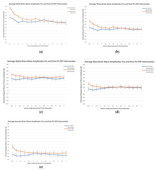 Estimated marginal means of brain wave amplitudes at pre- and post-28-day PC-PEP intervention in a sample of 30 PCa survivors from the Maritimes, Canada. (a) Delta brain wave amplitudes across sensor scalp assessment time; (b) theta brain wave amplitudes across sensor scalp assessment time; (c) alpha brain wave amplitudes across sensor scalp assessment time; (d) beta brain wave amplitudes across sensor scalp assessment time; (e) gamma brain wave amplitudes across sensor scalp assessment time.