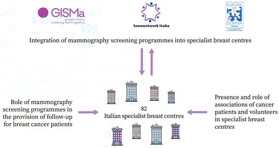 The Italian Group for Mammography Screening (GISMa), Senonetwork, and Europa Donna Italia carried out a national, cross-sectional, voluntary, online survey of Italian specialist breast centres [,]. Figure 1 depicts the three-section design of the protocol. The primary objective was to assess the degree of integration of mammography screening programmes into breast centres. One of the secondary objectives was to quantify the presence and assess the role(s) of associations in breast centres. In this article, the survey findings about this topic are briefly presented and discussed.