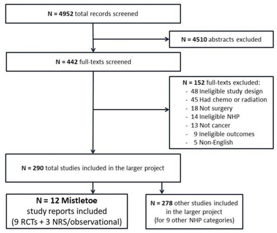 The details of the literature search, including title and abstract screening, full-article screening, reasons for exclusion within the larger project, and the number and type of studies for the mistletoe analysis, are presented in the study flow diagram in Figure 1. In summary, the searches retrieved 4952 records (abstracts) for the larger project, and 442 full-text articles were screened. Overall, 290 studies were eligible and included. For the mistletoe section, twelve relevant articles were included reporting on ten studies comprising seven RCTs in nine reports [15,68,69,70,71,72,73,74,75] and three observational cohort studies [76,77,78]. The seven RCTs included 633 participants in total.