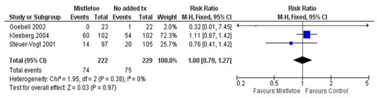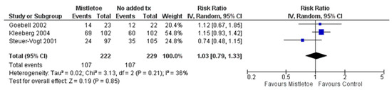 Figure 4 presents the forest plot of the meta-analysis for cancer recurrence. Similar to the mortality outcome for this comparison, three studies reported on cancer recurrence (the same studies reported on mortality outcome) and were included in the meta-analysis [68,70,75]. Follow-up time for assessing cancer recurrence varied between 18 months to 8 years. A random effects model was applied for meta-analysis as there was moderate statistical heterogeneity between the studies (I2 = 36%). The comparison of mistletoe versus no added treatment yielded no evidence of a difference in cancer recurrence (k = 3; N = 451; RR = 1.03; 95% CI, 0.79 to 1.33; p = 0.85). Metastasis outcome data were included in the recurrence meta-analysis data mentioned above, which revealed no evidence of a difference between the mistletoe and control group for recurrence (including metastasis). Two RCTs in this comparison reported on the incidence of distant metastasis. No other extractable data were reported within the five RCTs for this comparison regarding the other primary outcomes of the systematic review including treatment response, remission, and stable disease.