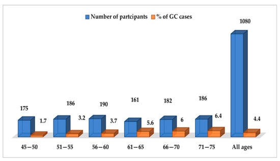 GC incidence varies significantly worldwide. Evidence suggests that there is no benefit in the widespread implementation of upper gastrointestinal (GI) endoscopy screening for GC in the general population of geographic regions with low incidence rates. The potential benefits of such screening in countries with intermediate risks are also uncertain [,,,]. However, a recent cost–utility analysis that employed a combination of endoscopy screening with gastroscopy and colonoscopy in volunteers aged between 50 and 75 years suggested that this combined screening may be cost-effective []. The current understanding of the role of upper GI endoscopy in preventing GC is that it serves as a valuable screening tool for predefined high-risk individuals [,]. The updated EU recommendations recently included GC screening, given the growing awareness of the GC burden []. Similar to the guidelines from multidisciplinary European societies, the British Society of Gastroenterology (BSG) guidelines also recommend upper GI endoscopy screening for predefined high-risk individuals aged over 50 years. These high-risk factors include being male, smoking, having pernicious anemia and/or having a family history of gastric cancer, along with being subjected to a follow-up for PGL [,]. In low-incidence regions, there are fewer data available on the endoscopic assessment and surveillance of PGL, which may negatively affect the yield of surveillance. Accordingly, after 2017,we implemented a GC screening program in Al-Kharj, Riyadh province, a central rural area of SA, for a period of five years in order to assess the prevalence of GC in this special target population, its clinicopathological profiles, as well as PGL and its association with risk factors. To the best of our knowledge, this is the first study to identify participants with PGL and to help in the prevention of GC by conducting surveillance examinations of these individuals every 3 years, according to international guidelines.