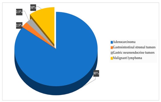The most prevalent histological type of GC observed in our study was primary adenocarcinoma, which is consistent with the findings of a recent meta-analysis of GC in the Arab world [] and a study conducted in northern Jordan []. Additionally, other histological types observed among GC patients in our study included malignant stromal tumors, lymphomas and carcinoids, which aligns with the results of a study conducted in Jordan []. Among the adenocarcinoma subtypes, the intestinal type, according to Lauren’s classification, was the most common [,], followed by the diffuse type, mixed type and adenosquamous carcinoma [,]. These findings are consistent with the patterns observed in GC classification studies conducted in Arab countries [].