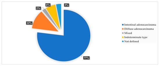 Over the past 50 years, the histopathological classification of GC has predominantly relied on Lauren’s criteria for histological classification []. One of the most common histological types of GC is adenocarcinoma, responsible for 90–95% of all cases. Adenocarcinomas are typically classified into two subtypes based on Lauren’s classification: diffuse and intestinal. Additionally, there is a mixed subtype that exhibits the characteristics of both diffuse and intestinal types []. Other less common types of GC are primary gastric lymphoma, gastrointestinal stromal tumors (GIST) and neuroendocrine tumors [].