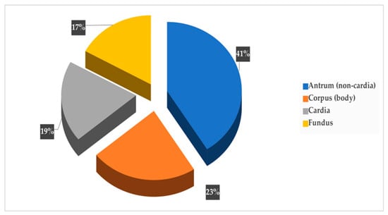 As presentedin Figure 5, GC tumors were most commonly located in the gastric antrum–pylorus (non-cardia) at 41% (20/48), followed by the corpus at 23% (11/48), the cardia at 19% (9/48) and the fundus at 17% (8/48).