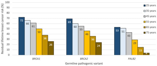 The average woman with a germline pathogenic variant in BRCA1/2 has a 69–72% (95% CI 61–79%) lifetime risk of developing breast cancer between the ages of 25 and 80 years old []. Pathogenic variants in the breast cancer susceptibility gene PALB2 are associated with an approximate 53% (95% CI 44–63%) lifetime risk of developing breast cancer, increasing to 68% in those with multiple affected first-degree relatives []. For BRCA1, peak breast cancer incidence occurs between 41 and 50 years, whereas for BRCA2 and PALB2, peak incidence occurs between 51 and 60 years of age [,]. As a result, patients considering RRM later in life will have already lived through a significant percentage of their cumulative risk and should be counselled accordingly; for example, a 70-year-old unaffected BRCA1/2 or PALB2 carrier harbors less than a 30% residual breast cancer risk to the age of 80 and may wish to consider enhanced surveillance over surgical prophylaxis. Thus, preventive decisions based on a patient’s “lifetime” risk should always incorporate a woman’s current age and her residual life expectancy [] (Figure 1).