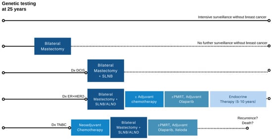 Possible breast-cancer-specific outcomes in BRCA1/2 and PALB2 carriers after genetic testing in early adulthood. Depending on specific germline pathogenic variant and family history, a significant minority of carriers who undergo surveillance may not develop breast cancer (row 1), while others may elect for bilateral risk-reducing mastectomy and forgo further imaging surveillance due to minimal residual lifetime risk (row 2). In carriers who develop breast cancer, treatment can vary depending on stage and tumor biology (rows 3–5), with the potential for recurrence and breast-cancer-related mortality. ALND axillary lymph node dissection; DCIS ductal carcinoma in situ; ER+HER2- estrogen receptor positive, HER2 negative breast cancer; PMRT postmastectomy radiation therapy; SLNB sentinel lymph node biopsy; TNBC triple negative breast cancer. Note: Axillary staging only required on the side of therapeutic mastectomy and if clinically indicated in the contralateral breast undergoing risk-reducing mastectomy.