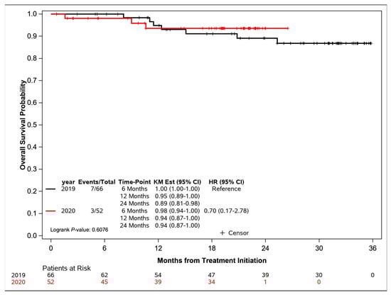 The median time to follow-up was 31 months for 2019 and 19.4 months for 2020. There was no significant difference in the unadjusted RFS and overall survival (Table 2). Of the 66 patients who started their treatment in 2019, ultimately, 7 (11%) patients died vs. 3 (6%) patients of the 52 patients who started treatment in 2020 (Figure 1), although the latter cohort’s follow-up interval is shorter. In 2019, the estimated overall survival probability at 6, 12, and 24 months from initiating treatment was 100%, 95%, and 89%, respectively. In 2020, the estimated overall survival probability at 6, 12, and 24 months from initiating treatment was 98%, 94%, and 94%, respectively (p = 0.61).