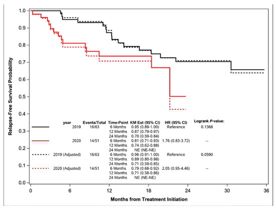 Of the 63 patients who started their treatment in 2019, 16 (25.4%) patients were diagnosed with a relapse during the follow-up period. Similarly, 14 (27%) of 51 patients were diagnosed with a relapse in the 2020 cohort. In 2019, the RFS probability at 6 and 12 months from initiating treatment was 95% and 87%, respectively (Figure 2). In 2020, the RFS probability at 6 and 12 months from initiating treatment was 81% and 74% (p = 0.14). After adjusting for stage, the RFS probability at 6 and 12 months for the 2019 cohort was 96% and 89%, respectively, and was 79% and 69% (p = 0.036) for the 2020 cohort, respectively. Additionally, after adjusting for stage and sex, the difference in RFS between cohorts remained significant (p = 0.05; Supplemental Figure S1).