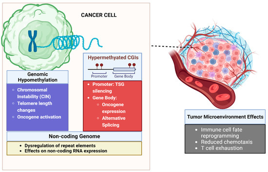 DNA methylation plays a critical role in maintaining genomic integrity by regulating the transcription of constitutive heterochromatin elements, sub-telomeric regions, and genomic repeats [21,22]. Expansive hypomethylation is common in cancer and may involve regions as large as ten megabases in size, which can render the cancer genome susceptible to genomic instability. Moreover, increased gene transcription from loss of gene promoter methylation results in the formation of DNA-RNA R-loops that can cause replication stress and DNA damage—further exacerbating genome instability [21,23]. Reduced methylation destabilizes heterochromatin at pericentromeric regions and is associated with loss of tumor suppression and oncogenesis in gastrointestinal cancers and sarcomas [21,22]. Telomere length is affected by methylation of sub-telomeric regions, and its dysregulation is considered a cancer hallmark [21,24,25].
