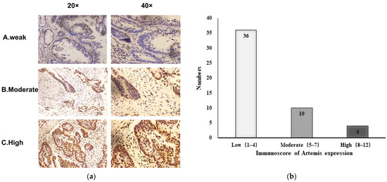 A total of 50 patients diagnosed with LARC were included in this study. All patients had undergone preoperative chemoradiotherapy and surgical treatment. We retrospectively analyzed the clinicopathological characteristics of these patients and the Artemis expression in biopsy tissues before chemoradiotherapy, as shown in Table 1. The characteristic microscopic appearance of Artemis immunostaining of the biopsy specimens is shown in Figure 1a, indicating that the Artemis protein was mainly located in the nucleus. The expression level of Artemis protein was determined using the scoring method mentioned earlier. Among the 50 patients, 36 (72%) with Artemis protein immunoscore 1–4 were weakly positive, 10 patients (20%) with Artemis protein immunoscore 5–7 were moderately positive, and 4 patients (8%) with Artemis protein immunoscore 8–12 were highly positive (Figure 1b). Furthermore, no significant differences in clinical features, such as sex, age, tumor location, clinical T stage, and clinical N stage, were observed between the two groups (p > 0.05) (Table 1).