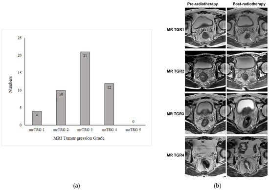 The MRI results pre- and post radiotherapy were independently reviewed by two experienced abdominal radiologists. The tumor response to preoperative chemoradiotherapy was evaluated using mrTRG. For inconsistent results, a consensus was reached through discussion. The mrTRG results are shown in Figure 2a. Among 47 patients, 4 achieved a radiological complete response and were considered as mrTRG1, 10 were mrTRG2, 21 were mrTRG3, and 12 were mrTRG4. None of them was mrTRG5. The representative image of mrTGR is shown in Figure 2b.