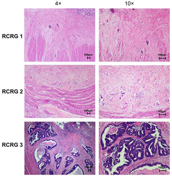 All resection specimens were examined by the pathologists. The regression of primary tumors was determined according to Wheeler’s RCRG criteria. The representative image of RCRG results is shown in Figure 3. Among 50 patients, 17 (34%) showed a “good” response to preoperative chemoradiotherapy (RCRG1), whereas 4 patients (8%) demonstrated a “poor” response (RCRG3). The remaining 29 patients (58%) showed marked fibrosis but with macroscopic tumors still present (RCRG2) (Table 3).