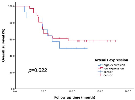 The Kaplan–Meier method was applied to assess overall survival (OS). There was no significant difference in 5-year OS rate between patients with low Artemis expression and those with high Artemis expression (p = 0.622).