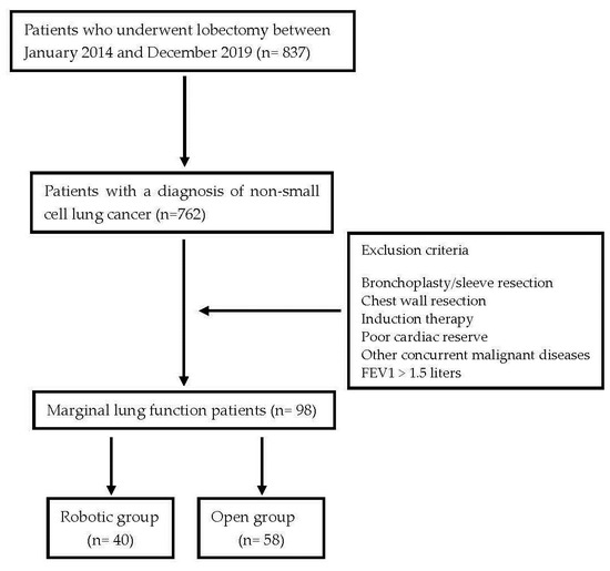 Data from marginal pulmonary function patients who underwent robotic or open lobectomy with hilar/mediastinal lymphadenectomy between January 2014 and December 2019 were retrospectively collected and analyzed.