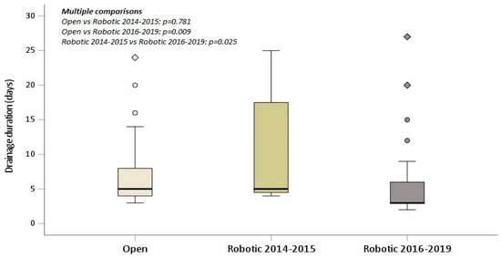 Drainage duration box plot displaying statistical significance for the three-group study.