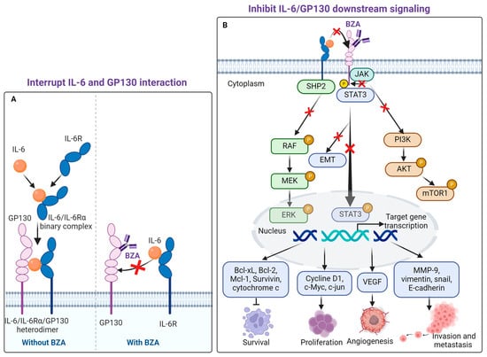 BZA interrupts IL-6 and GP130 interaction and inhibits IL-6/GP130 downstream signaling (A) IL-6 binds with IL-6R to create a binary complex, the interaction between GP130 and the IL-6–IL-6 receptor-α (IL-6Rα) binary complex forms the IL-6/IL-6Rα/GP130 heterodimer (left panel, on the left side of the dashed line). By binding to GP130 directly, BZA prevents the interaction of IL-6 with GP130. This inhibition blocks the formation of the IL-6/GP130 receptor complex (right panel, on the right side of the dashed line), and (B) IL-6 binds to GP130, leading to the activation of several cell signaling pathways, including JAK/STAT3, PI3K/AKT, and Ras/Raf/MAPK. BZA inhibits STAT3 signaling by either blocking the IL-6/GP130 interaction or preventing the phosphorylation of JAK. Additionally, BZA reduces AKT and MAPK signaling by decreasing the phosphorylation of AKT and ERK, respectively. These pathways are crucial for transcription of genes associated with cell survival, proliferation, angiogenesis, invasion, and metastasis.