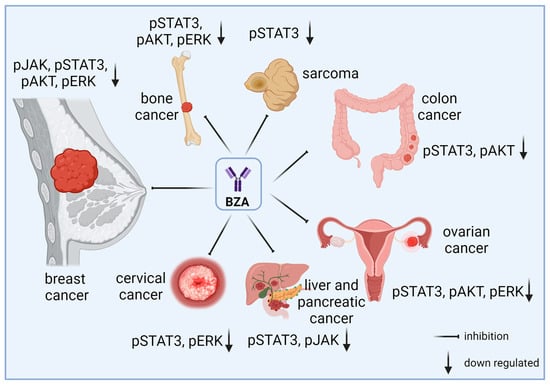 Bazedoxifene (BZA) exhibits promising antitumor effects in various types of cancer beyond breast cancer, colon cancer, and ovarian cancer (Table 3). Xu et al. (2016) found that resistance to common chemotherapeutic agents, such as doxorubicin, cisplatin, and MEK inhibitors, was observed in rhabdomyosarcoma cells with elevated levels of phosphorylated STAT3. Inhibiting GP130/STAT3 signaling with BZA can sensitize these cancer cells to treatment, thereby reducing cell viability and inducing apoptosis [48]. BZA treatment reduced the viability and proliferation of pancreatic cancer cells by interfering with IL-6/GP130 signaling. This blockade disrupts key metabolic processes, including glycolysis, and diminishes the cells’ ability to form colonies, indicating a decrease in their oncogenic potential [49]. BZA was found to inhibit cell viability, wound healing, and colony formation in various liver cancer cell lines (HEPG2, 7721, and HUH-7). Furthermore, the study revealed a significant inhibition of tumor growth in HEPG2 mouse xenografts following daily oral administration of BZA. The underlying mechanism involved the reduction of IL-6-induced STAT3 phosphorylation by BZA [59]. Similarly, BZA showed activity in brain tumors, such as glioblastoma multiforme (GBM), which is a highly aggressive brain tumor that arises from astrocytes. BZA, either alone or in conjunction with paclitaxel, demonstrates the ability to inhibit cell survival and invasion of glioblastoma cells by inducing apoptosis and mitigating EMT. Moreover, BZA, combined with other chemotherapeutic agents, such as paclitaxel, accelerates the phosphorylation and inactivation of YAP (Yes-associated protein), a key regulator of cell proliferation and survival [55]. Similarly, BZA can modulate the EMT signaling pathway and reduce cell migration and invasion in HPV-positive cervical cancer cells [56]. Moreover, BZA has shown efficacy against osteosarcoma tumors, where it inhibits cell proliferation, induces cell cycle arrest, and promotes apoptosis by inhibiting IL-6 and IL-11/GP130 signaling, suggesting its potential as a therapeutic agent for bone malignancies [76]. These findings underscore the broad spectrum of antitumor effects of BZA across different cancer types, highlighting its potential as a promising therapeutic option for diverse malignancies.