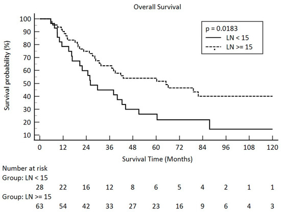 In our study, only the pathologic stage, the pathologic T stage, and the number of lymph nodes were related to disease-free survival. The p-values were 0.0076, 0.0006, and 0.0114, respectively. The Kaplan–Meier survival curve between the different pathologic lymph node groups is illustrated in Figure 3. The median number of retrieved lymph nodes was 19 and illustrated in Figure 4.