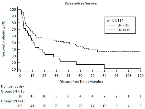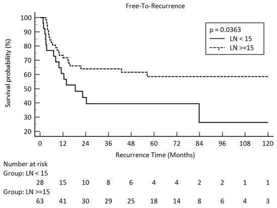 Regarding recurrence, the number of lymphadenectomies has been correlated with disease-free survival in some studies [16,17]; however, many studies have showed varying results [8,10]. In our series, lymph nodes dissection of <15 is a significant risk factor not only in Kaplan–Meier survival, but also in the Cox proportional hazards regression analysis in the variate of “Free-To-Recurrence”.