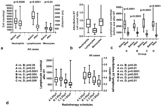 Figure 1. Hematological toxicity after radiotherapy (RT): (a) neutrophil, lymphocyte, and monocyte counts before and after RT in all patients; (b) graphical representation of the after/before RT ratios of neutrophil, lymphocyte, and monocytes in all patients; (c) lymphocyte counts before and after RT according to the group of patients treated with the different RT schedules; (d) lymphocyte counts after RT and after/before RT lymphocyte ratios in the four groups of patients. Box and whisker plots show the median value, 25th–75th percentile values, and range.