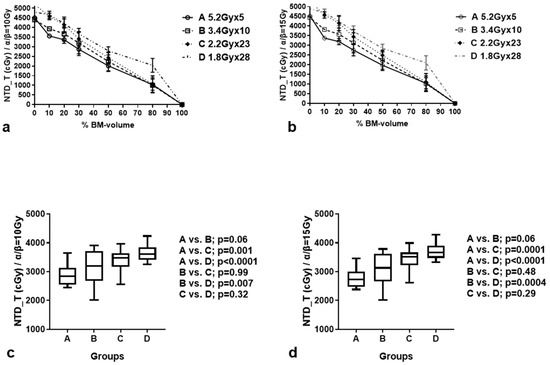 Table 1 reports the time-corrected NTD_T (±standard deviation) calculated at 10%, 20%, 30%, 50%, and 80% of the BM volume, according to the RT scheme. Figure 2a,b shows the dose/volume plots of the BM for each RT scheme. The NTD_T to the chosen BM volumes gradually increased from groups A to D, whether calculated for α/β = 10 Gy or 15 Gy. Table 2 shows the multiple comparisons. At D30%, the hypofractionated schemes of groups A and B delivered significantly lower NTD_Ts to the BM compared to group D (p < 0.01; Figure 2c,d). Moreover, the difference between groups A and C was also significant (p < 0.001). There was no significant difference between the NTD/NTD_Ts delivered by the A and B RT schemes (marginally lower D30 in group A; p = 0.06), or the B and C RT schemes (p > 0.48).