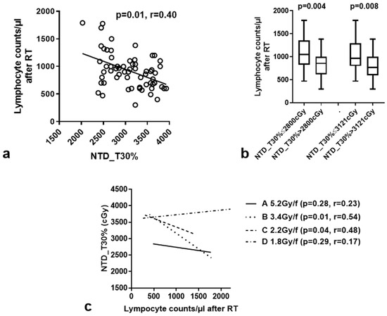Figure 3. Linear regression analysis of NTD_T (α/β = 15 Gy) delivered to 30% of the bone-marrow volume (NTD_T30%) and lymphocyte counts after RT for all patients (a) and for each RT schedule separately (c). (b) shows the box and whisker plots (median value, 25th–75th percentile values and range) of lymphocyte counts after RT according to two distinct cut-off point of NTD_T30% [33rd percentile (2800 cGy) and the median value (3121 cGy) of NTD_T (all patients) delivered to 30% of the BM].