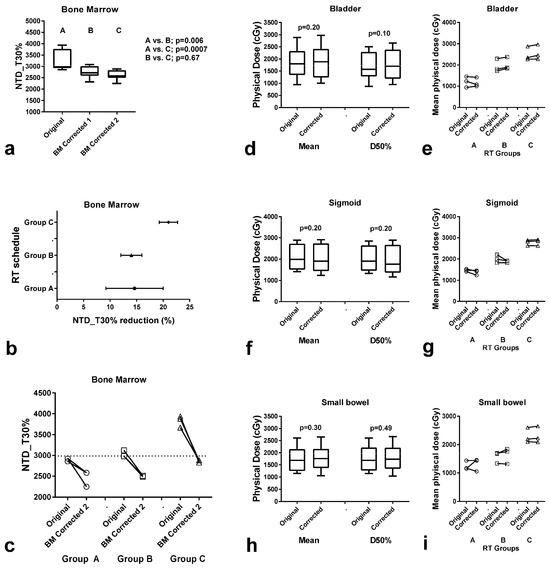 Figure 4. Radiotherapy (RT) dose to the bone marrow (BM) and organs at risk (OARs: bladder, sigmoid, small bowel) after correction of RT planning for BM as an OAR. NTD_T delivered to 30% of the BM (NTD_T30%) before and after correction for the BM (BM-corrected-1 and -2 = without and with removal of the BM of the iliac and ischium bones from the PTV) in all 9 patients (a) and according to the RT schedule (b,c). Box and whisker plots (median, 25th–75th percentile values, and range) in all 9 patients (d,f,h) and individual value plots in each patient group (e,g,i) of the physical dose (mean and at 50% volume–D50%) delivered to the bladder (d,e), sigmoid (f,g) and small bowel (h,i) before and after BM-correction-2.