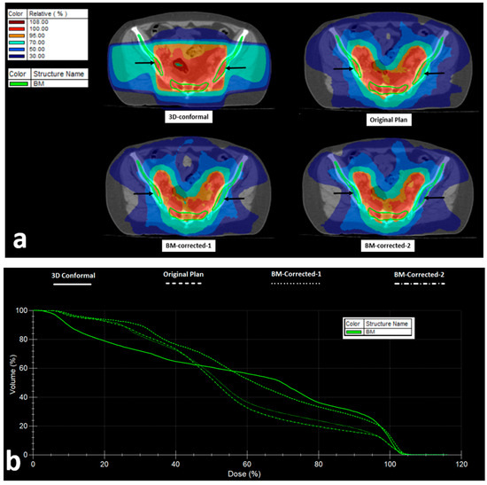 Figure 5. VMAT Radiotherapy planning and bone marrow (BM) dose distribution: (a) Isodose areas distribution in 3D-conformal, VMAT (original), and VMAT plans taking into account the bone-marrow as an organ at risk (BM-corrected-1), and VMAT with PTV correction to exclude the BM from iliac and ischium bones (BM-corrected-2) (black arrows show the iliac BM area). (b) Dose–volume histograms of the bone marrow in the four abovementioned RT plans.
