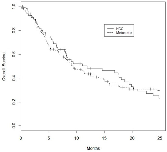 Kaplan–Meier Survival curves for HCC and metastatic datasets. Median overall survival is 11.9 months for the HCC dataset and 9.4 months for the metastatic dataset.