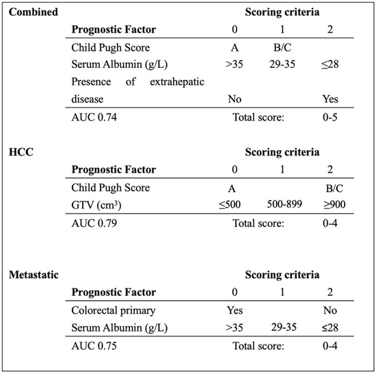 RT to the liver using modern techniques is generally well tolerated [4]. From the patient’s perspective, there can be a temporary worsening of appetite and fatigue, but quality of life measures generally return to baseline by 3 months [5]. Still, there remains a wide range in survival of patients in the literature, and it would be prudent to avoid irradiating patients who are unlikely to survive long enough to benefit from the treatment, thus saving them the potential short-term toxicities. The Child–Pugh Score [6], Barcelona Clinic Liver Cancer score (BCLC) [1], Model for End-Stage Liver Disease (MELD) [7], Albumin–Bilirubin model (ALBI) [8,9], and Cancer of the Liver Italian Program (CLIP) [7] are measures that have been developed to predict patient outcomes specific to liver disease; however, none of these were developed for patients being assessed for RT and none focused on identifying patients who should not receive radiation.