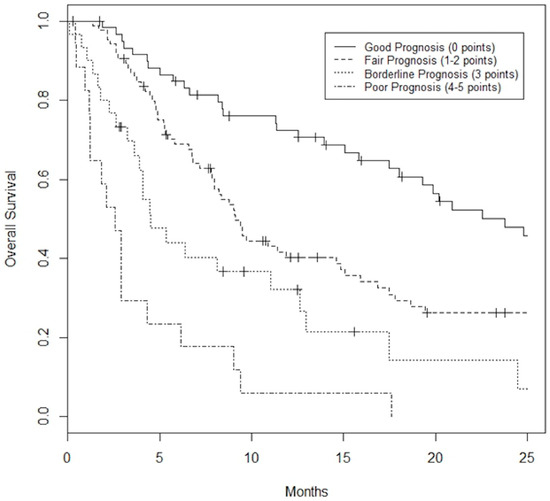 Kaplan–Meier Survival curves based on PILiR score for the combined dataset. Patients can be classified as Good Prognosis (0 points) with a median survival of 23.8 months, Fair Prognosis (1 or 2 points) with a median survival of 9.1 months, Borderline Prognosis (3 points) with a median survival of 4.5 months, or Poor Prognosis (4 or 5 points) with a median survival of 2.6 months.
