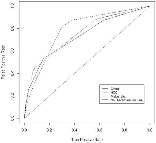ROC for combined dataset, HCC dataset and metastatic dataset. The area under the curve (AUC) was 0.74, 0.79, and 0.75, respectively.