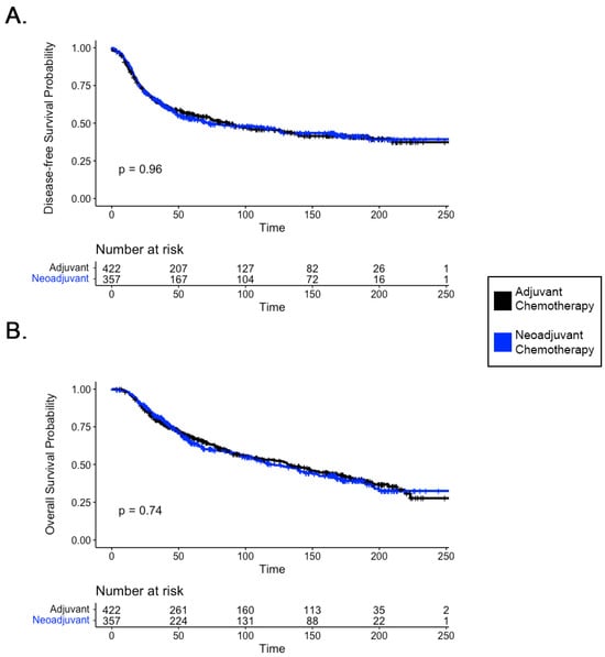 The clinical management of locally advanced breast cancer (LABC) differs significantly from that of early-stage disease []. LABC is associated with a higher incidence of distant metastasis and poorer survival outcomes compared to early-stage breast cancer [], highlighting the need to investigate outcomes in this specific patient subset independently. In the early-stage breast cancer population, a large-scale meta-analysis of individual patient data by the Early Breast Cancer Trialists’ Collaborative Group (EBCTCG) found no survival disadvantage to the preoperative use of systemic chemotherapy []. The result of our analysis confirms that this finding also extends to patients with LABC receiving neoadjuvant versus adjuvant chemotherapy, demonstrating no significant difference in disease-free and overall survival (Figure 1).