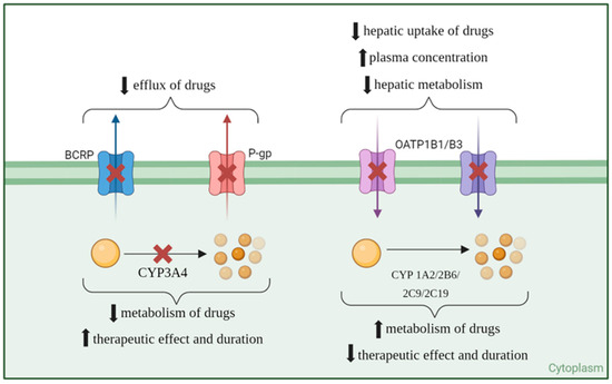 Apart from the effect on CYP enzymes, ritonavir has also been shown to inhibit another important class of compounds: the drug transporters. Ritonavir is known to inhibit P-gp expression and activity, which can alter the pharmacokinetics of co-administered drugs [15]. For example, ritonavir affects the distribution of indinavir and significantly increases the systemic exposure of fexofenadine, a P-gp substrate [16]. Furthermore, ritonavir acts as an inhibitor of breast cancer resistance protein (BCRP), alongside saquinavir and nelfinavir, enhancing intracellular drug concentrations by inhibiting BCRP-mediated efflux. This inhibition is clinically significant, as it can affect the bioavailability of drugs that are substrates for BCRP [17]. OATP1B1, OATP1B3, and OATP2B1 are organic anion-transporting polypeptides that play crucial roles in the hepatic uptake of various endogenous compounds and xenobiotics, including multiple drugs. Ritonavir exhibits strong inhibitory effects on both OATP1B1 and OATP1B3. Additionally, ritonavir effectively inhibits OATP2B1, although the inhibitory effects are substrate-dependent. This illustrates the complexity of ritonavir’s interaction with different OATP isoforms, emphasizing the importance of context in understanding these interactions [18]. Figure 2 shows a visual representation of ritonavir’s inhibition or induction of drug transporters and metabolizers and the consequent effect on co-administered drugs’ concentration and effect.