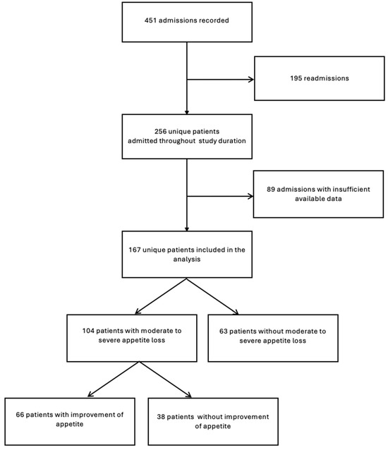 Descriptive statistics were applied. Means and medians were reported for continuous variables to describe central tendencies, and standard error (SE) or range as a measure of variability. Frequencies and proportions were reported for categorical variables. The patients were classified into the groups ‘appetite loss’ or ‘no appetite loss’, based on self-reported score at admission. Patients with a self-reported score ≥ 4 (NRS 0–10) were considered to have clinically significant appetite loss. Patients with appetite loss at admission were then classified into two groups based on whether appetite improved or not during hospitalization. Improvement was defined as an increase in the appetite score by SI ≥ 1 during the hospital stay. Additionally, we investigated the frequency and increase in dose or initiation of new pharmacological treatments to understand their potential impact on appetite improvement.