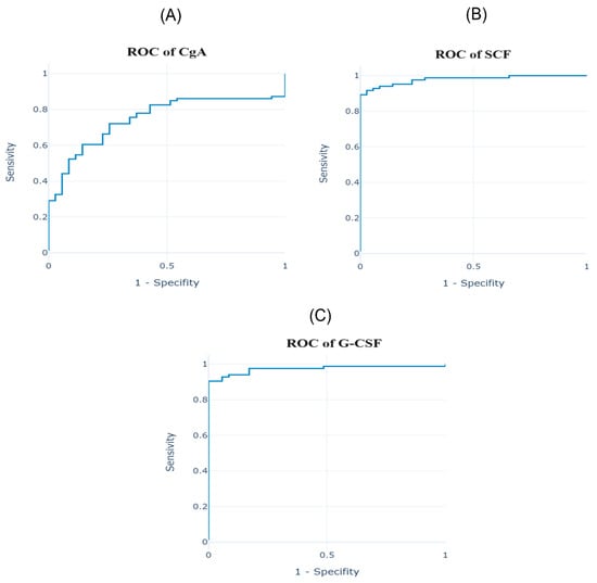 Receiver operating characteristic (ROC) of serum cytokines of the patients diagnosed with neuroendocrine neoplasms (NENs). (A)—ROC of chromogranin A (CgA); (B)—ROC of stem cell factor (SCF); (C)—ROC of granulocyte colony-stimulating factor (G-CSF); (D)—ROC of nerve growth factor β (β-NGF); (E)—ROC of interleukin 16 (IL-16); (F)—ROC of monocyte chemotactic protein 1 (MCP-1).