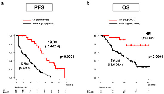 The median PFS in the CR group (n = 24) was 19.3 months (95%CI: 15.4–26.4 months), which was significantly longer than the 6.9 months (95%CI: 3.7–9.0 months) in the non-CR group (n = 96, p < 0.0001) (Figure 2a). The median OS in the CR group was not reached (95%CI: 21.1 months–NR), which was significantly longer than the 19.3 months (95%CI: 13.6–26.4 months) in the non-CR group (p < 0.0001) (Figure 2b).