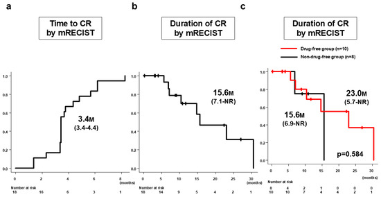Time to CR by mRECIST and duration of CR by mRECIST in patients who achieved CR by Atz/Bev alone (n = 18). (a) Median time to CR by mRECIST was 3.4 months (95%CI: 3.4–4.4 months). (b) Duration of CR by mRECIST was 15.6 months (95%CI: 7.1 months–NR). (c) Median CR duration for the drug-free group (n = 10) was 23.0 months (95%CI: 5.7 months–NR months) and for the non-drug-free group (n = 8) was 15.6 months (95%CI: 6.9 months–NR), with no significant difference between the groups (p = 0.584). CR, complete response; mRECIST, modified Response Evaluation Criteria in Solid Tumors; Atz/Bev, atezolizumab/bevacizumab; CI, confidence interval.