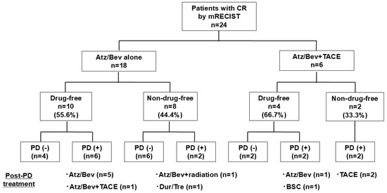 In the 18 patients who achieved CR by mRECIST with Atz/Bev alone, at the time of the analysis, 8 patients had PD. Post-PD treatment options included Atz/Bev alone in five patients, Atz/Bev + TACE in one patient, Atz/Bev + radiation in one patient, and durvalumab/tremelimumab in one patient. Among the six patients who achieved CR by mRECIST with Atz/Bev + additional TACE, four patients showed PD. The post-PD treatment options included TACE in two patients, Atz/Bev alone in one patient, and best supporting care in one patient.