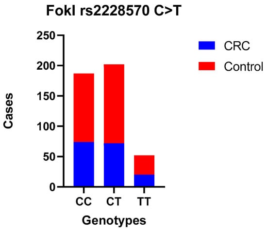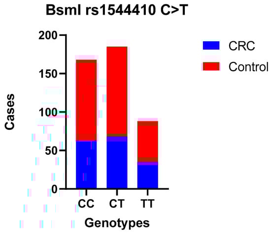 Undoubtedly, the risk of sporadic CRC has been linked to environmental conditions (e.g., lifestyle, dietary habits, smoking) and genetic factors [35]. Vitamin D insufficiency has been linked to various diseases and metabolic disorders, including cancers [36]. The functionality of vitamin D is primarily dependent on its interaction with the VDR gene. In cases where the VDR gene exhibits reduced responsiveness, this can result in a manifestation of vitamin D deficiency. Additionally, the VDR gene plays a crucial role in innate immunity, contributing to the prevention and eradication of infections and influencing the composition of the gut microbiome [37,38,39].