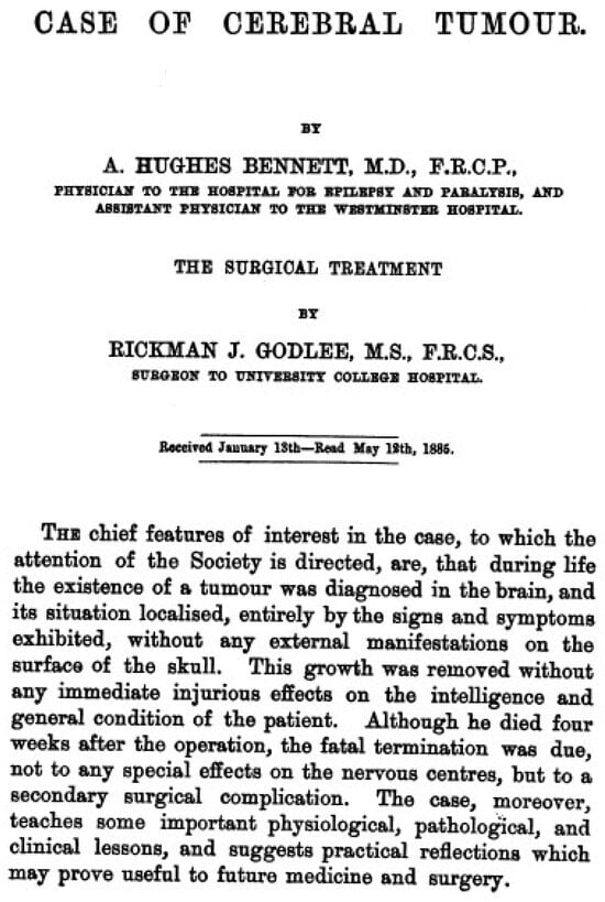 The first manuscript detailing the resection of a glioma in a 25-year-old patient was published in 1884 by Bennett and Godlee. Adapted from Ref. []. No copyright permission required as publication is older than 70 years.