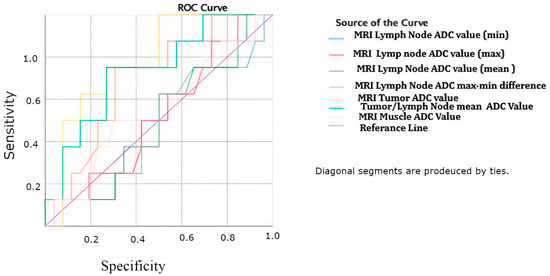 The diagnostic power, sensitivity, specificity, threshold, and critical values of the ADC values related to the results of the ROC curve analysis are shared in Table 4, and the ROC curves corresponding to these results are shown in Figure 1 below. According to the results, the diagnostic power of the MRI tumor ADC value in detecting the disease was found to be 78.4%, while the diagnostic power of the Tumor ADC/Lymph node mean ADC ratio value was found to be 73.6% and statistically significant in detecting the pathological lymph node (p = 0.047). The diagnostic powers of other ADC values were not statistically significant, but the MRI lymph node ADC max–min difference was found to be the result closest to the critical value of p < 0.05 (p = 0.096). A threshold (cut-off) value of 0.935 with a sensitivity of 0.750 and a specificity of 0.731 was determined for the MRI tumor ADC value. For the Tumor ADC/Lymph node mean ADC ratio, the threshold value corresponding to a sensitivity of 0.750 and a specificity of 0.731 was determined as 1.118.