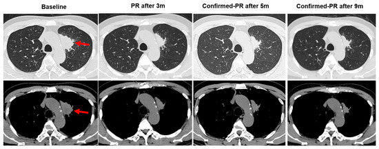 Changes in primary lesions on chest CT images pre- and post-entrectinib therapy. The chest computed tomography (CT) scan images showing the location of tumor lesions found in the left upper lung (red arrows). After taking entrectinib, 600 mg/day, orally for 3 months, the tumor showed a decrease in size; oral administration of entrectinib for 5 months indicated the tumor continued to shrink in size; oral administration of entrectinib for 9 months showed that the tumor was continuously reduced in size. PR: partial response.